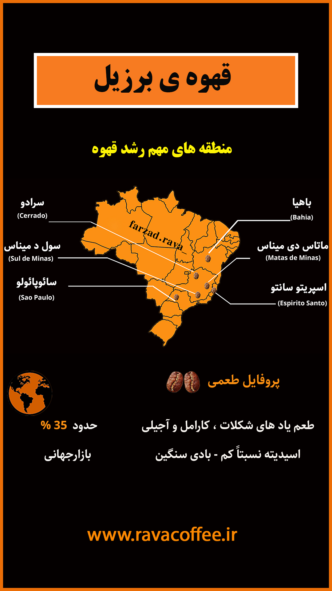 🔰البته قهوه هایی که در ارتفاعات بالاتر این کشور کشت میشوند محصول باکیفیت تری پرورش میدهند و #طعم_یاد های ملایمی از میوه ها دارند اما به ندرت میشود که #اسیدیته و ترشی میوه ای از قهوه های برزیل گرفت !
