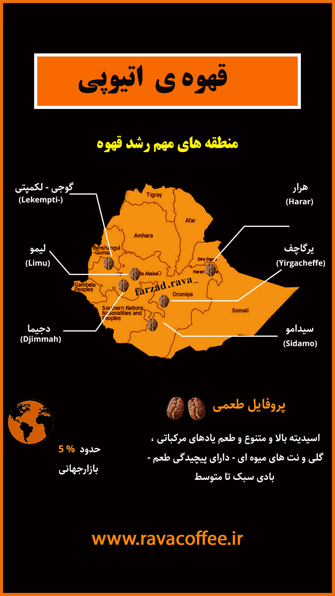 🔰 قهوه ها در اتیوپی هم بطور تخصصی و هم در رده های تجاری و با روش های متنوع فراوری (نچرال ، واشد و...) و از مناطق رشد قهوه ی این کشور مثل یرگاچف ، سیدامو ، گوجی ، هرار ، لیمو و ... به سراسر جهان صادر میشود